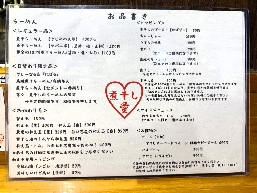 トッピングで注目すべきはは煮干しのブースト「にぼブー」、そしてスープがドロドロになり、煮干し感と塩分がアップする「煮干し愛」。