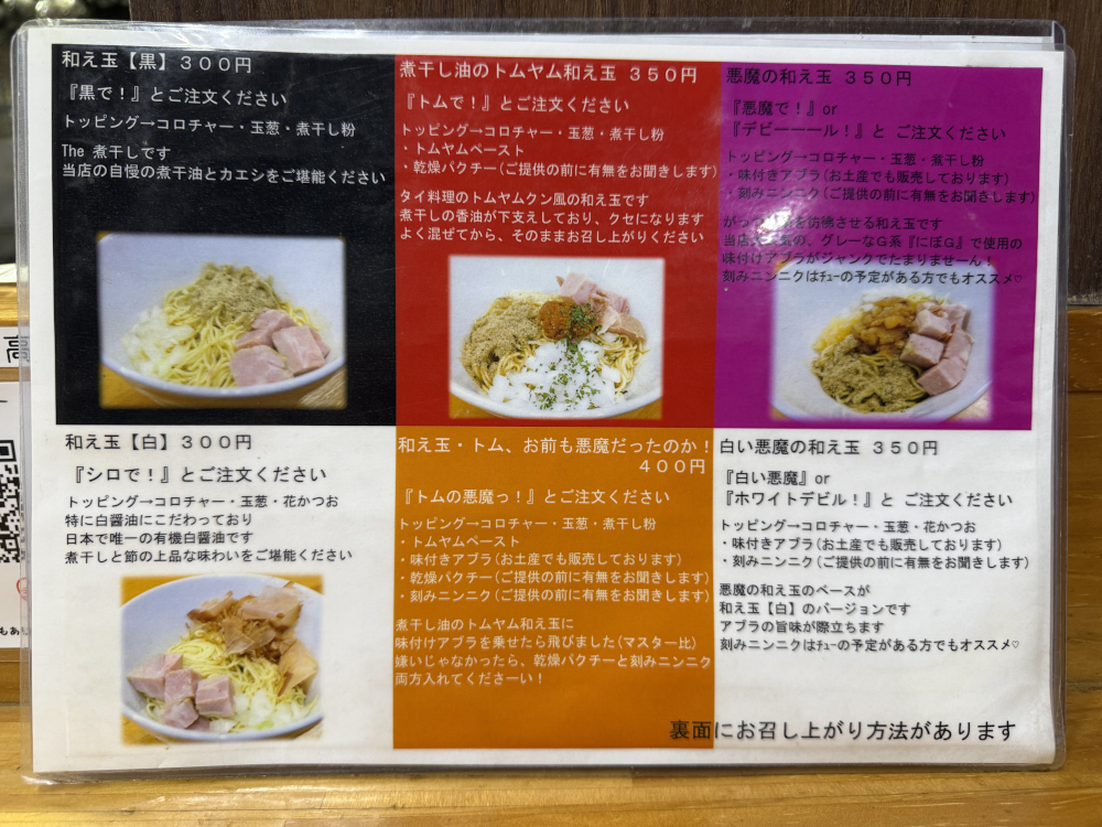 さて、ラーメンを食べ終わったものの、もうちょっと食べたい欲が……。替え玉にするか和え玉にするべきか悩んだ末、「悪魔の和え玉」をチョイスしました。