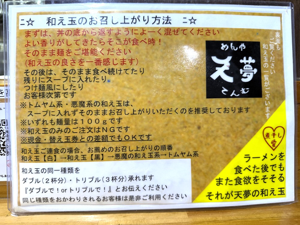 超濃厚な煮干ラーメンから淡麗系まで展開する、めんや天夢。マニアから煮干し初心者ユーザーまできっと楽しめるはずです。