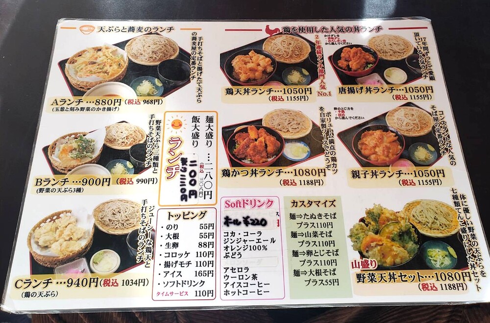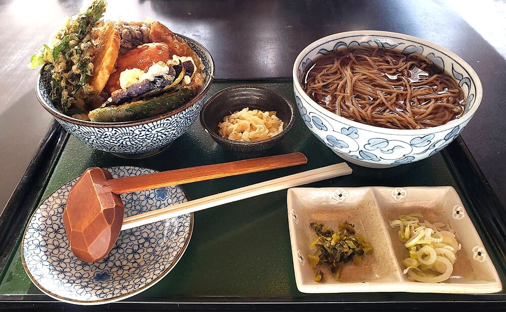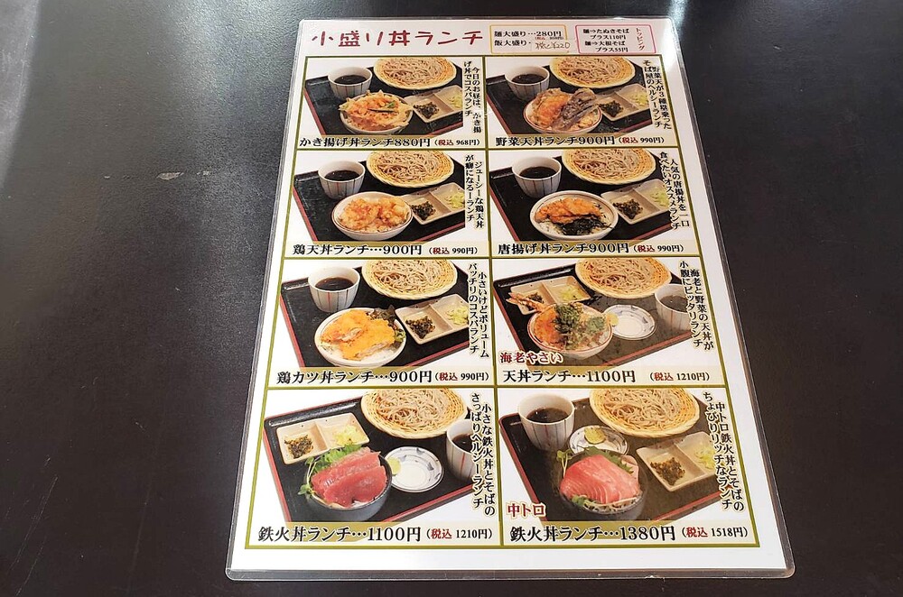 お蕎麦単体でも注文できますが、ランチでは豪華に天ぷら付きのメニューや、丼ものとのセットメニューなどが用意されています!見てるだけで食欲をそそりますね。