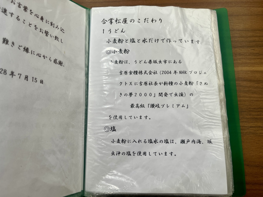 お店を開店した経緯や、使用している小麦粉・塩・出汁・天ぷら粉などのこだわりが記載されています。