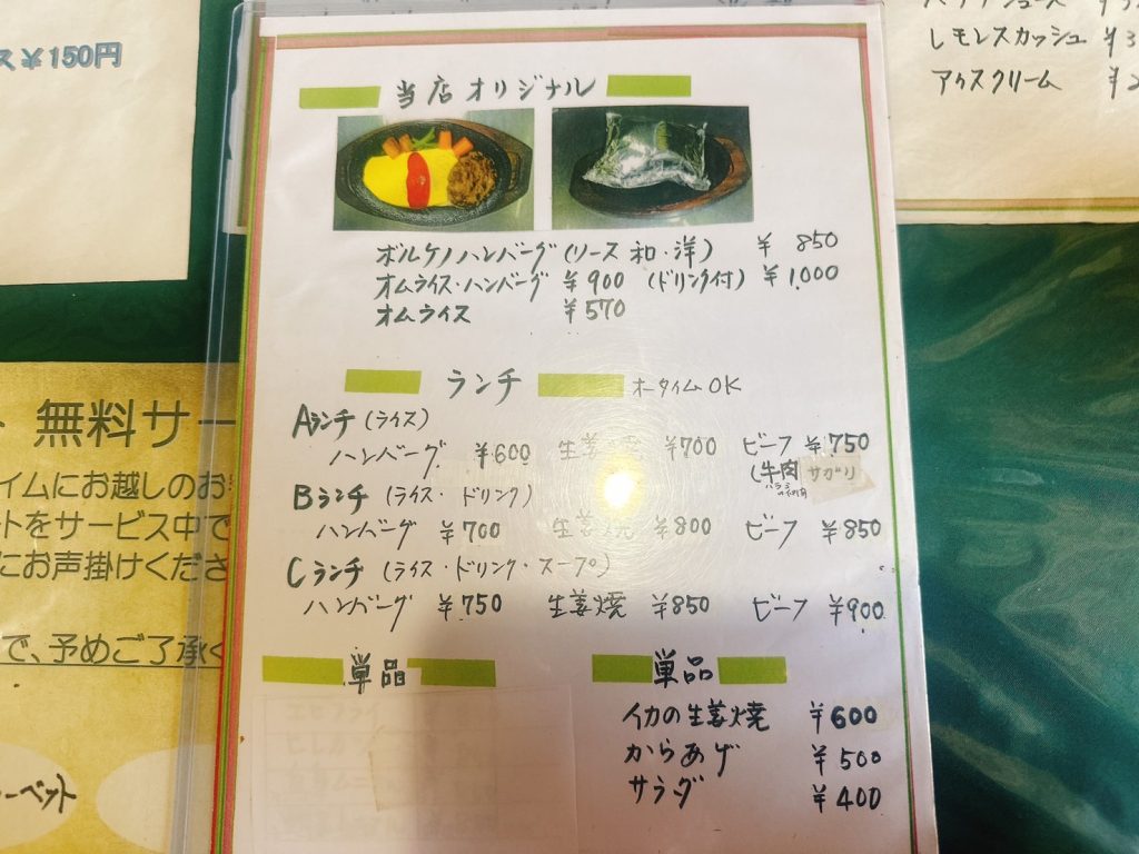 こちらがメインメニュー。ランチは夜でも注文可能です。しかもお値段このまま!今どきこのお値段でランチも驚きますが、夜となるとかなりお安いと思います。