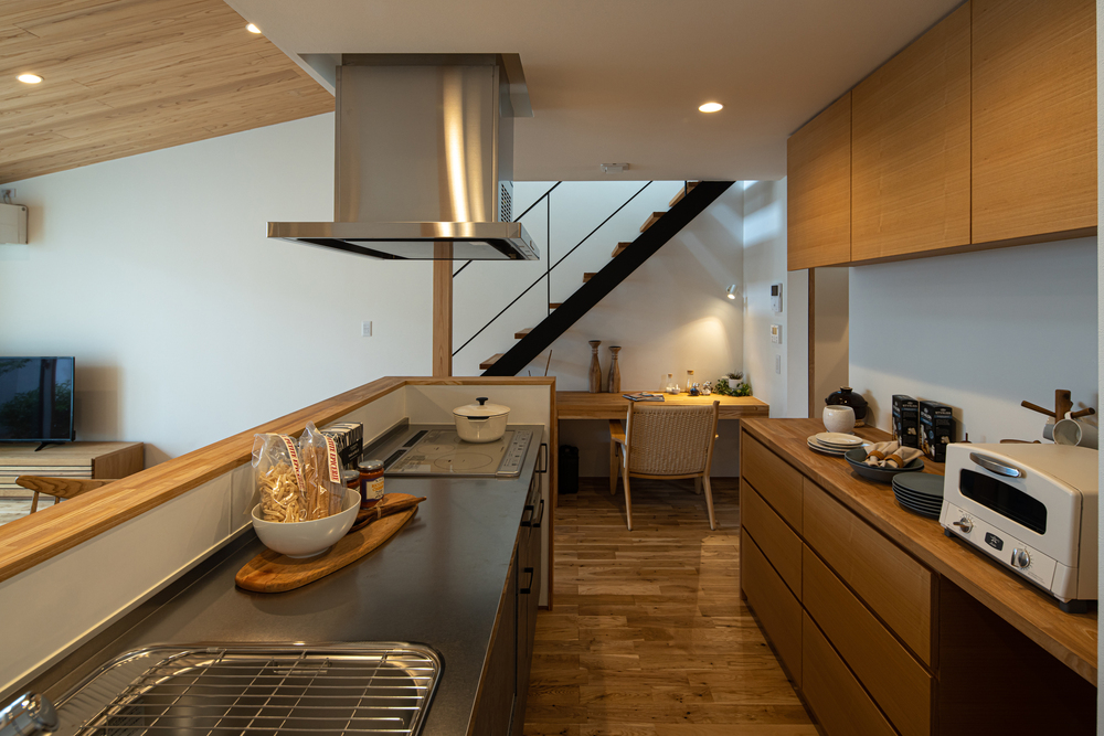キッチンバック収納は無垢材を使用したオリジナルの食器棚が印象的。隣にはカウンターコーナーもあり、ちょっとしたデスクワークも可能です。