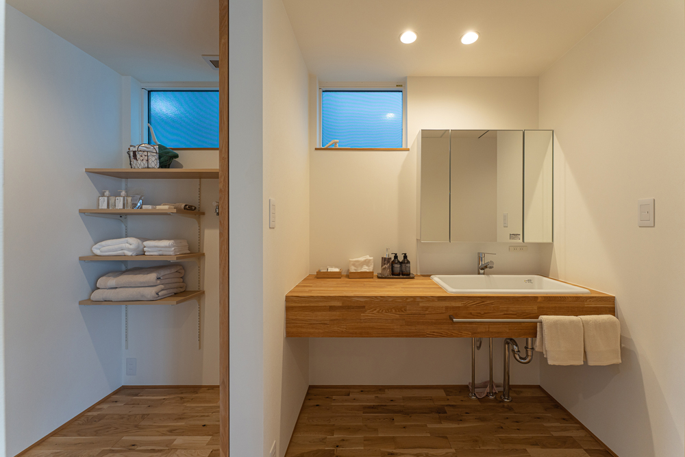 使うほどに愛着の増す造作洗面台は脱衣所とは別空間に。デザイン性と使いやすさを考えつつ、プライバシーにも配慮しています。