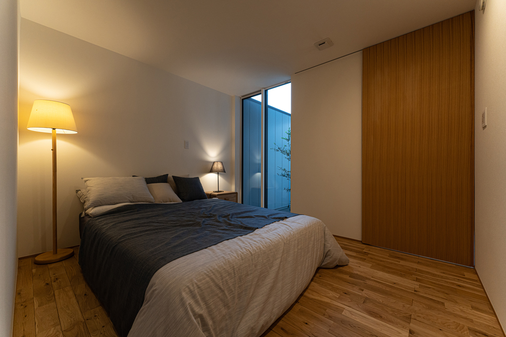 キッチン裏に設計された1階の寝室は、テラスに面しているので、ベットに寝転びながら空を眺められる癒しの空間です。