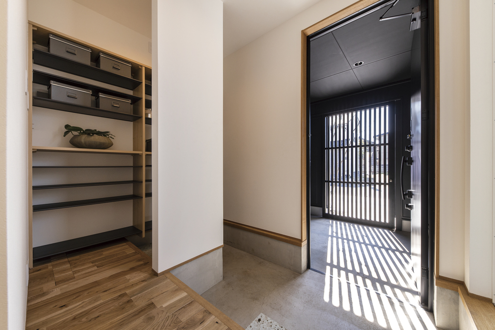 土間スペースを隣接させている玄関は、シューズクロークも設け、収納力抜群。