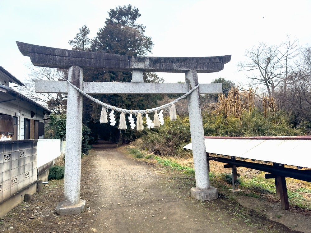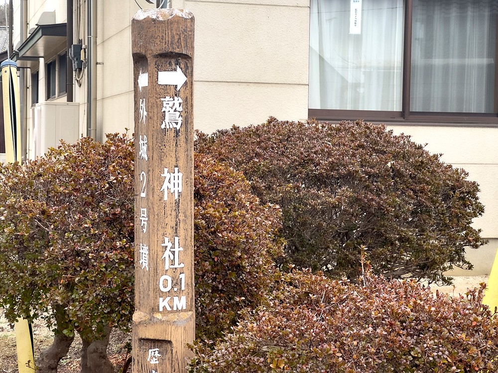 ほどなくして、鷲城跡に到着。正面には石造りの小さな鳥居があり、長い年月を経た風格を感じさせます。
