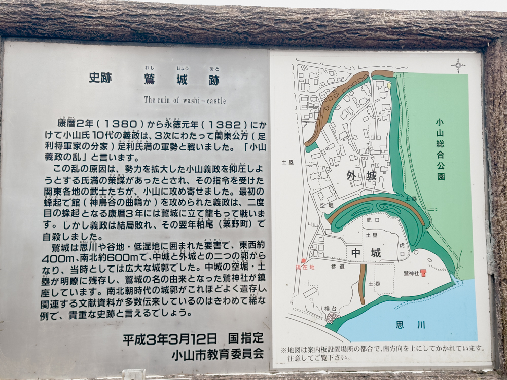 境内の入口には鷲城跡の案内板が設置されています。ここには、この地を治めていた小山氏の歴史が詳しく書かれていました。