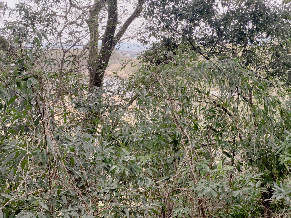 さらに神社の裏手へ回ると、木々の間から思川が流れる景色が見えました。一般的に城と聞くと、高い塀で囲まれた要塞のようなイメージを持つかもしれませんが、実際には川を天然の防御施設として利用することが多かったのです。