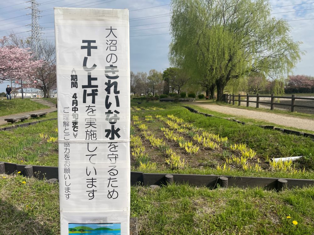 大沼に訪れたら、とてもびっくりしました。令和5年4月中旬まで「干しあげ」ということで、ため池の水が全くありませんでした。とてもレアなタイミングです。「かいぼり」とも呼ばれ、水の品質などを維持していくための方法だそうです。水を抜き、土を乾かす作業です。池の底を空気にさらして微生物による分解を促進し、水質を浄化するそうです。本来は農業目的のために行われてきた作業。近年は水質保持のために行うことが多いようですね。