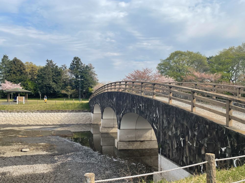 池の周りを歩くと、素晴らしい風景が続きます。少し歩いた先に橋がかかっています。本来なら池には水があります。水がない上にかかる橋の姿も貴重です。お弁当を持参して、豊かな自然を楽しみながら食べるご飯も抜群においしいですよ!