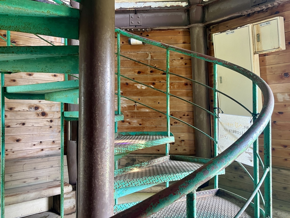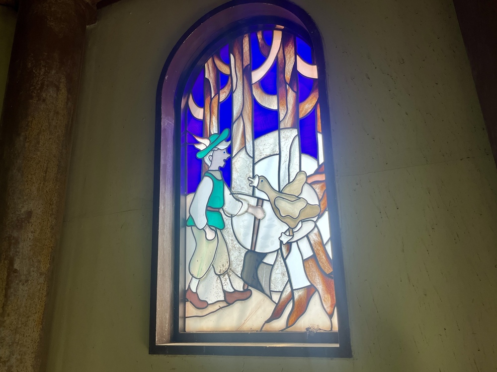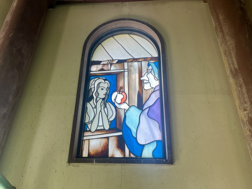 風車展望台の中に入って螺旋階段をのぼっていくと、窓がグリム童話のステンドグラスになっていました。