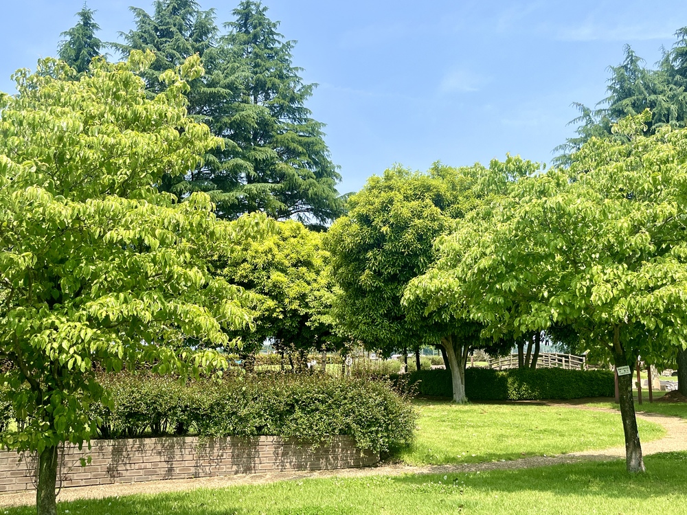 駐車場の前には長いベンチがあり、ドイツトウヒやユリノキ、ハナミズキの木々を眺めながらゆっくりと寛げます。