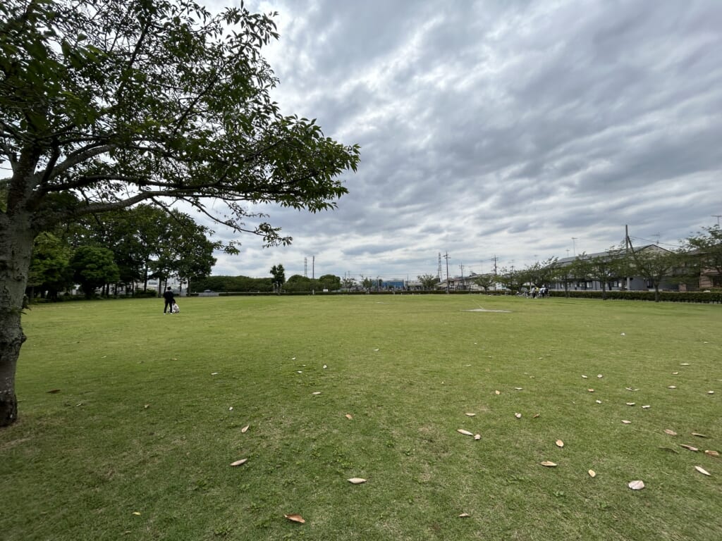 さらに魅力なのが、上段遊具エリアの横にある、この広々とした芝生エリア。何にもなくて、すごく広いです。この日も端の方でサッカーをする学生、バトミントンをする学生がいましたが、まだまだ余裕の広さ。住宅街とは思えない開放感です。