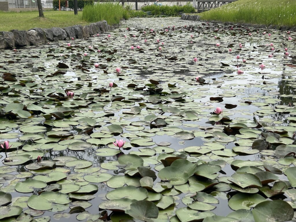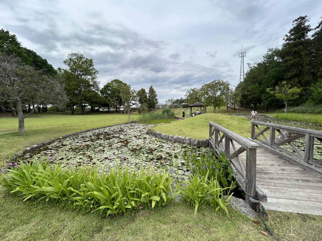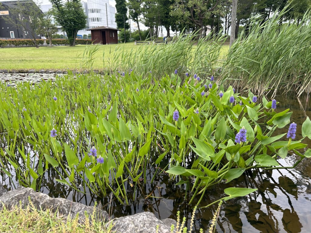 池には一面に水生植物が咲いており、とても綺麗です。あめんぼうやめだかがたくさんいます。子供たちが魚とり網で一生懸命取っていて、落ちたらと少し心配になりましたが、池はそこまで深くはなさそうでした。