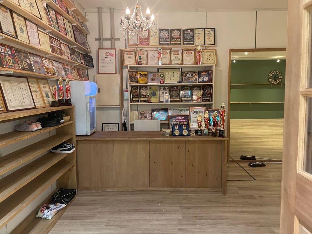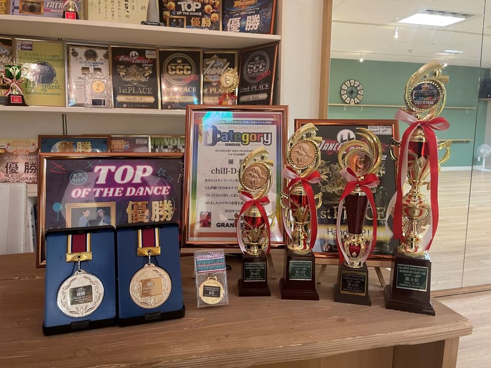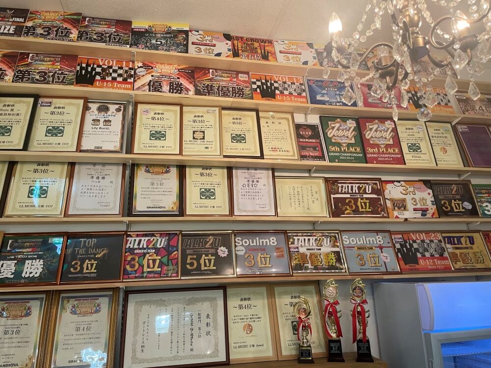スタジオ入り口に飾られてあるさまざまな賞状やトロフィー。これまでのスタジオの歴史を物語っています。ダンスのコンテストに挑戦してきた、努力の結果が素晴らしいですね!