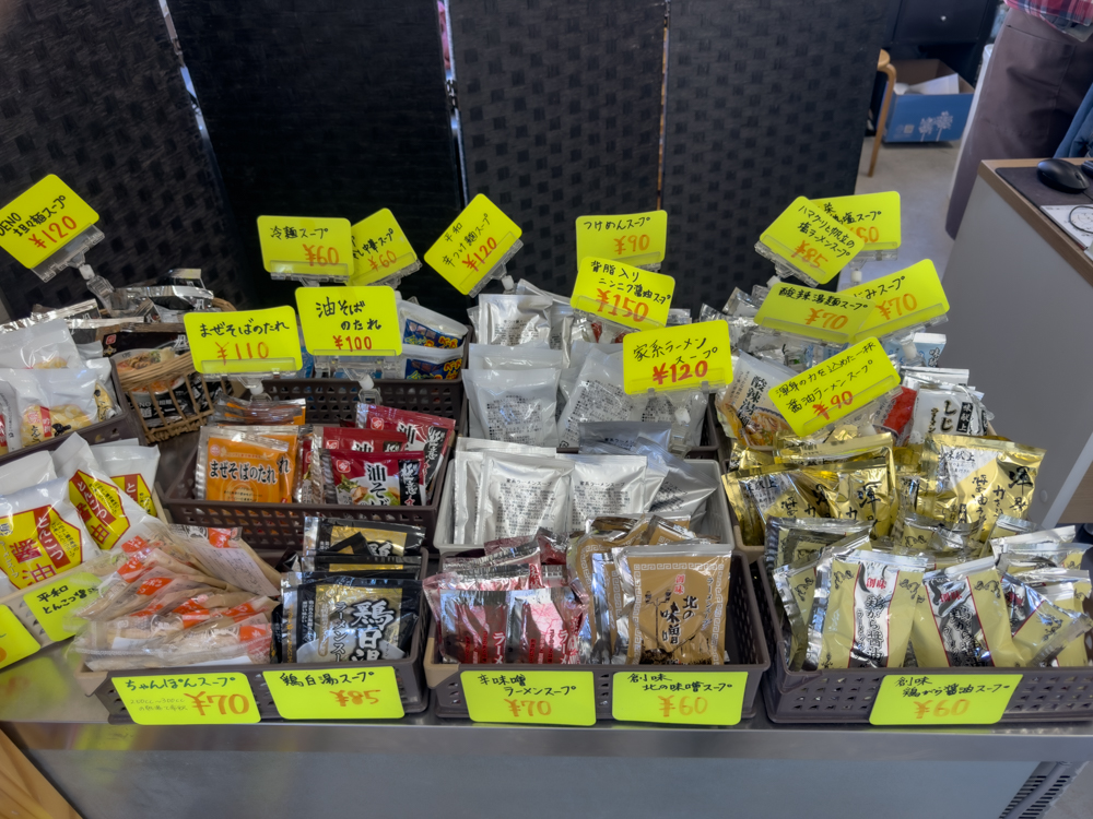 普段いろいろなスープなどを見かけますが、麺の直売所だからこその品揃えも目立ちます。たまには変わったものを食べたいなという時、通販でもいろいろ買えますが、やはり手軽に店で買えるのはうれしいです。