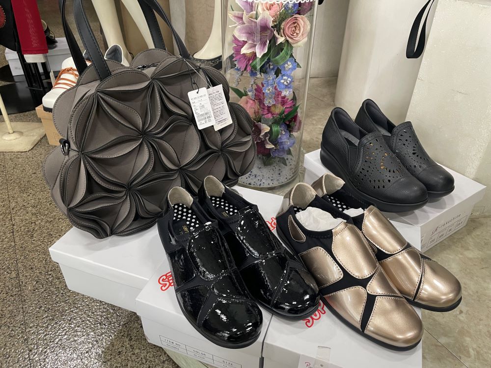 写真左上のカバンはお花のような形だけど、カラーが落ち着いた色なので上品に着こなせそうです。くつは確かに他店では、あまり見ないデザイン!おしゃれです。