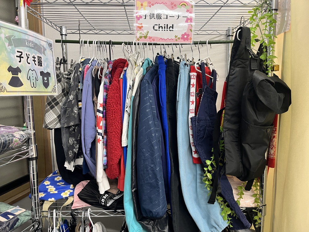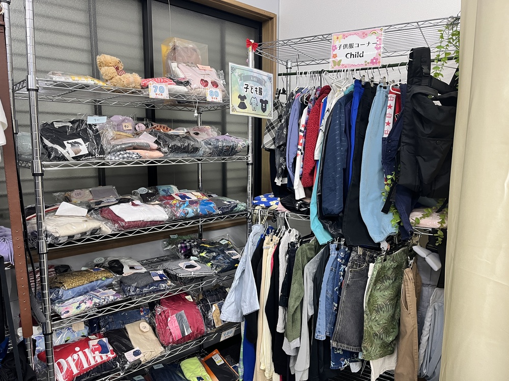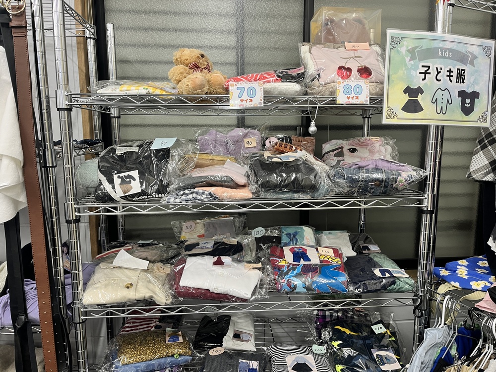 子ども服コーナー。新生児サイズ〜小学生サイズまで揃っていました。