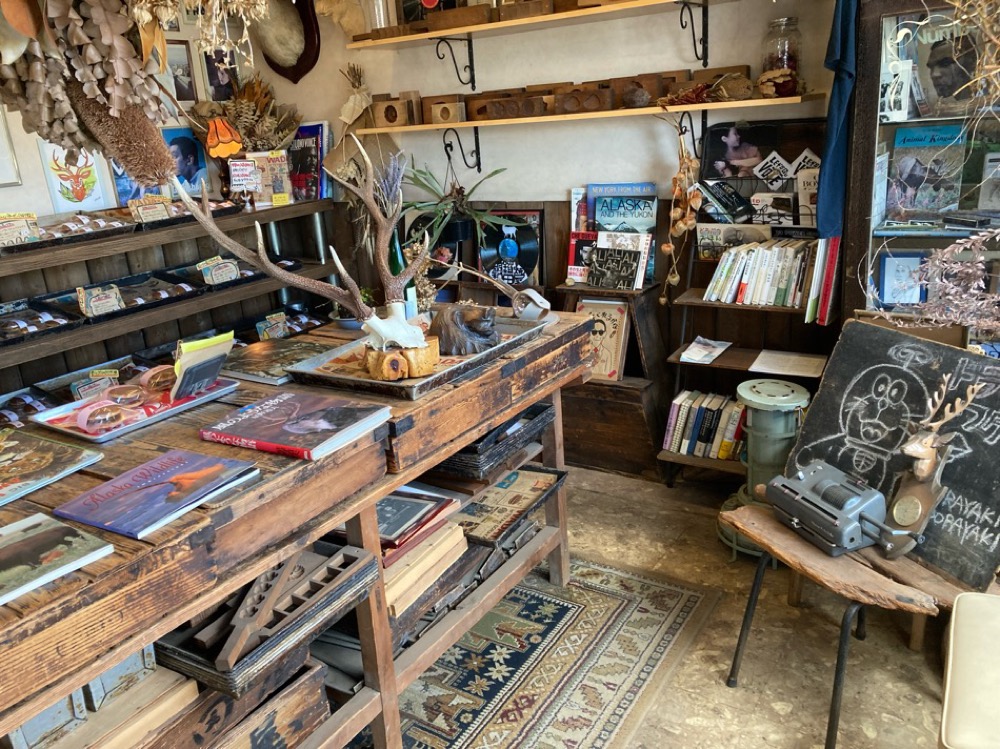 店内に足を踏み入れた瞬間、そこがどら焼き屋さんであることを忘れてしまいそうなほどモダンな雰囲気が広がります。大きな鹿の角や、レコード、古本など独特な空気を醸し出していますね。ドラえもんやタモリさんのイラストまで……見れば見るほどわくわくが膨らみます。