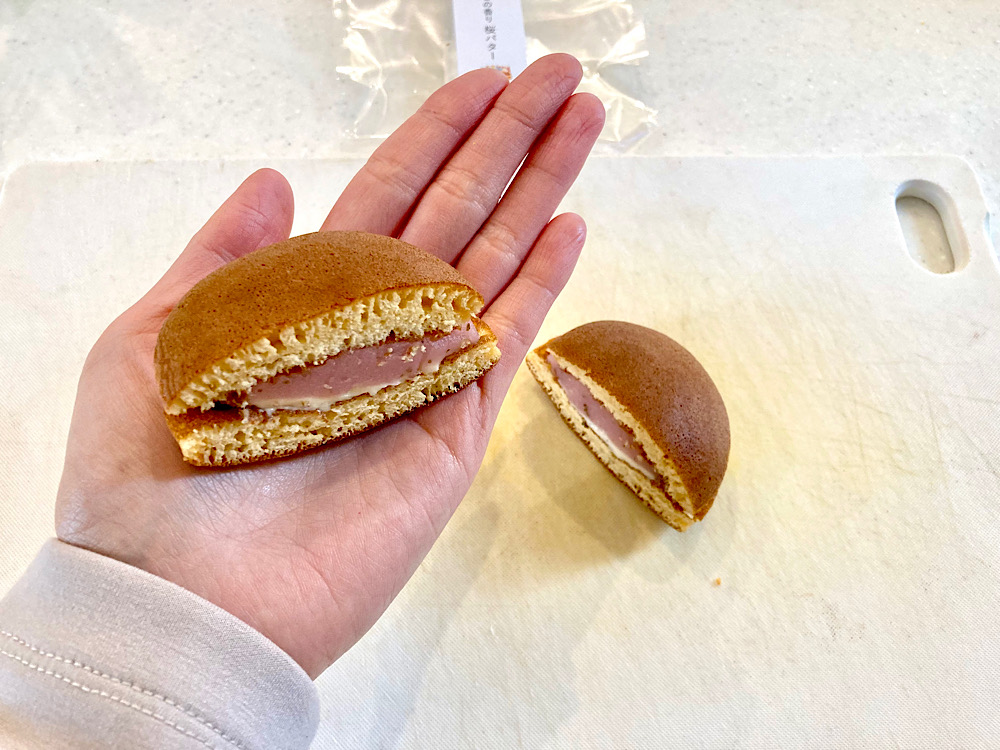 さっそく開封!「桜バター」を半分に切ってみると見事な断面。さくらあんとバタークリームがぎっしりです。