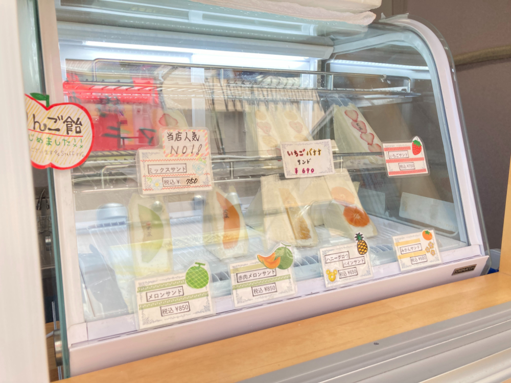看板でメニューを見ていると、店員さんに「今ある分しかないのでこちらからお選びください」とフルーツサンドのショーケースに案内されました。