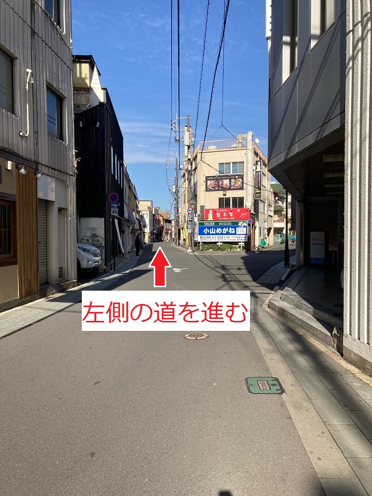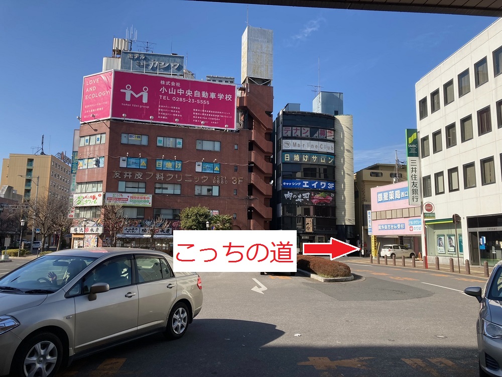 小山駅西口を出て右側に進み、突きあたりを右に曲がります。
