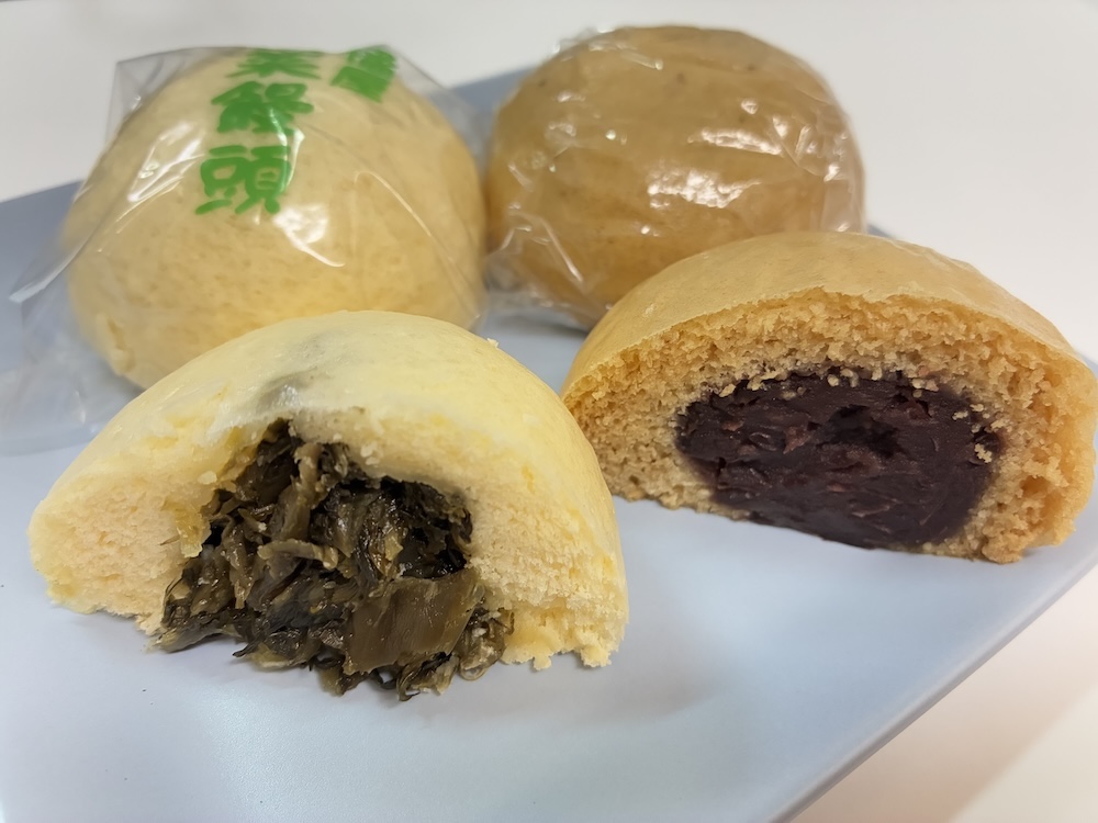 その「高菜まんじゅう」と、ごまと正油(しょうゆ)を使った「ごま正油まんじゅう」も食べてみました。